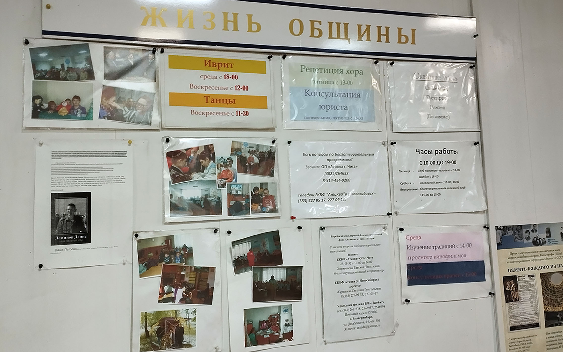 К слову, располагается еврейская община в здании синагоги, признанном объектом культурного наследия регионального значения. Читинская синагога была построена около 1880 года на углу улиц Ингодинской и Камчатской (теперь Столярова). Около 300 квадратных метров из трех тысяч занимает еврейская община. Григорий Еремин не раз подчеркивал, что без ремонта исторический объект постепенно разрушается. Государство восстанавливать его не берется, и членам общины его не отдают, хотя они готовы взяться за восстановление объекта.