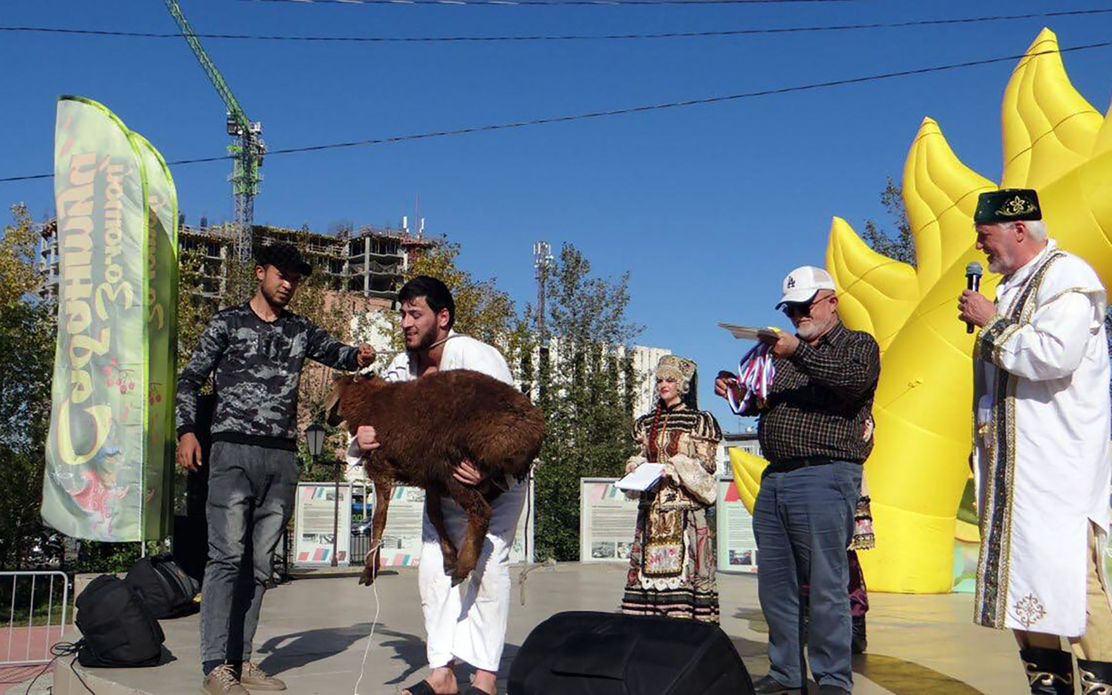 Самой оживленной и громкой стала площадка, где проходила традиционная борьба куреш, организованная таджикской диаспорой. Здесь на кону был живой баран.