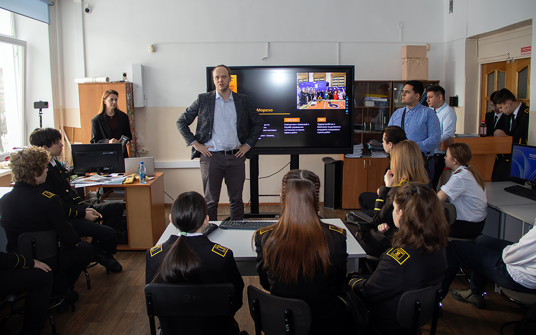 В круглом столе приняли участие два наших партнёра: «Мангазея Майнинг», «Быстринский ГОК». Они рассказали о своём опыте взаимодействия с молодёжью. В компаниях ведётся активная профориентационная работа, заключаются целевые договоры, студенты колледжа после прохождения практики на предприятиях в числе первых получают приглашения к трудоустройству, специалисты компаний участвуют в реализации образовательных программ, проводят совместные чемпионаты и конкурсы. Всё было показано в цифрах для наглядности.