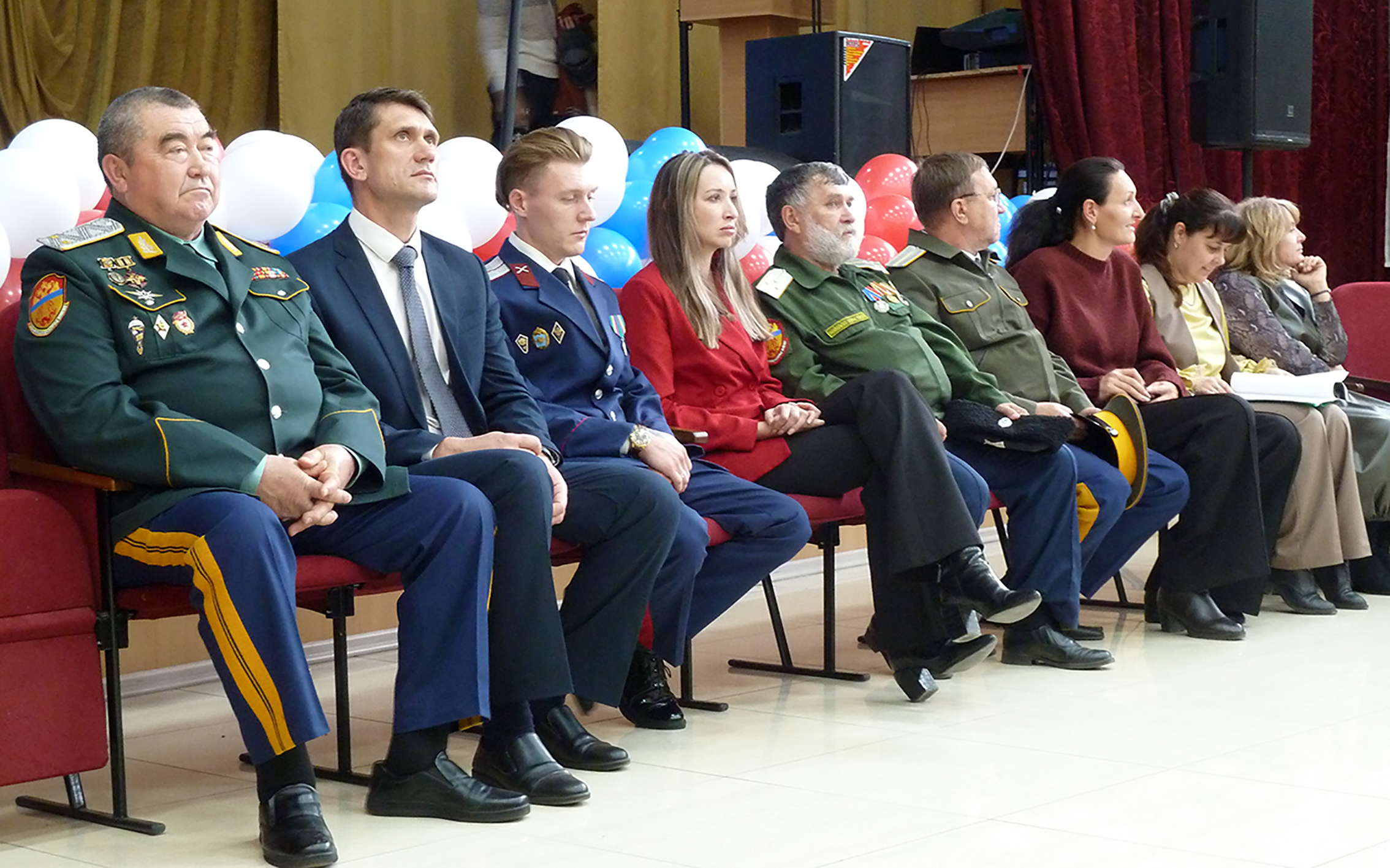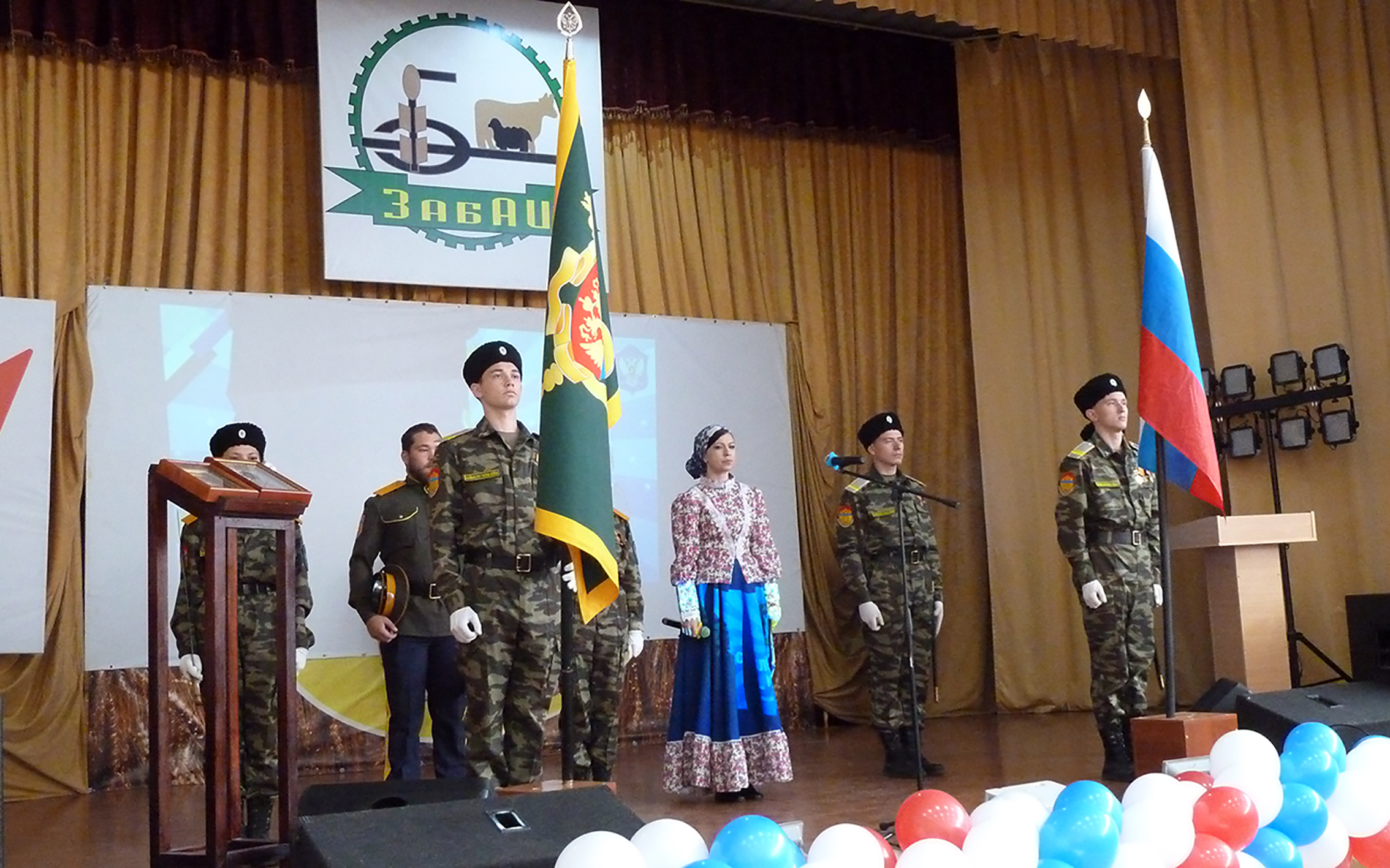 Сцена в актовом зале была украшена трёхцветными воздушными шарами, символизирующими, конечно, триколор. Флаг России и флаг ЗВКО казачата торжественно внесли и установили на сцене аккурат перед самым открытием. А вот и начало.