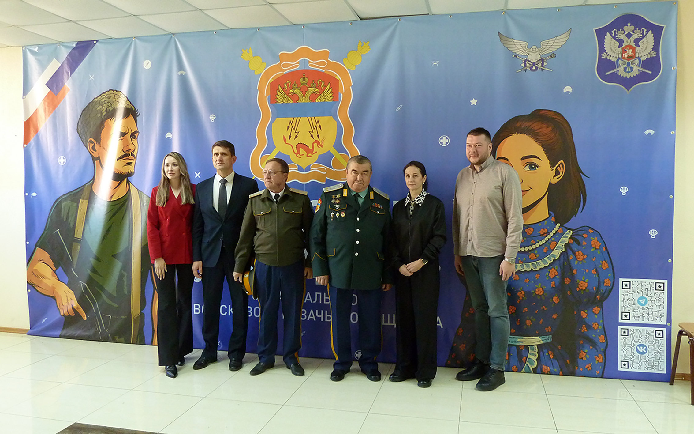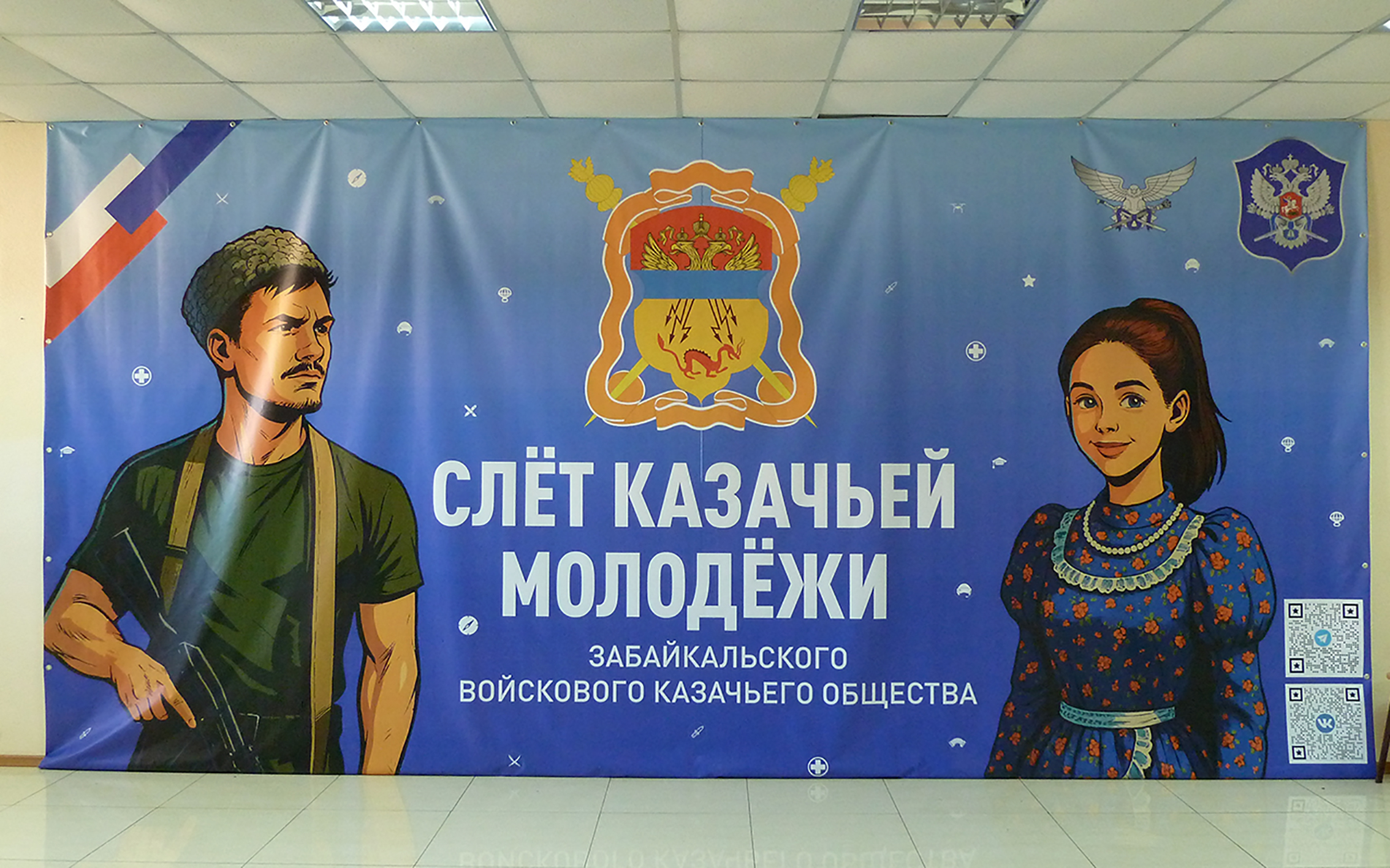То, что организаторы постарались создать особую атмосферу, стало понятно сразу же. В коридоре, у входа в актовый зал, гостей слёта встречали несколько больших и красочных баннеров. Один, например, был установлен в качестве фотозоны: на чистом фоне цвета неба красовались образы молодых казака и казачки, герб ЗВКО и название мероприятия крупными буквами. А другой баннер — дань уважения казакам-участникам специальной военной операции.