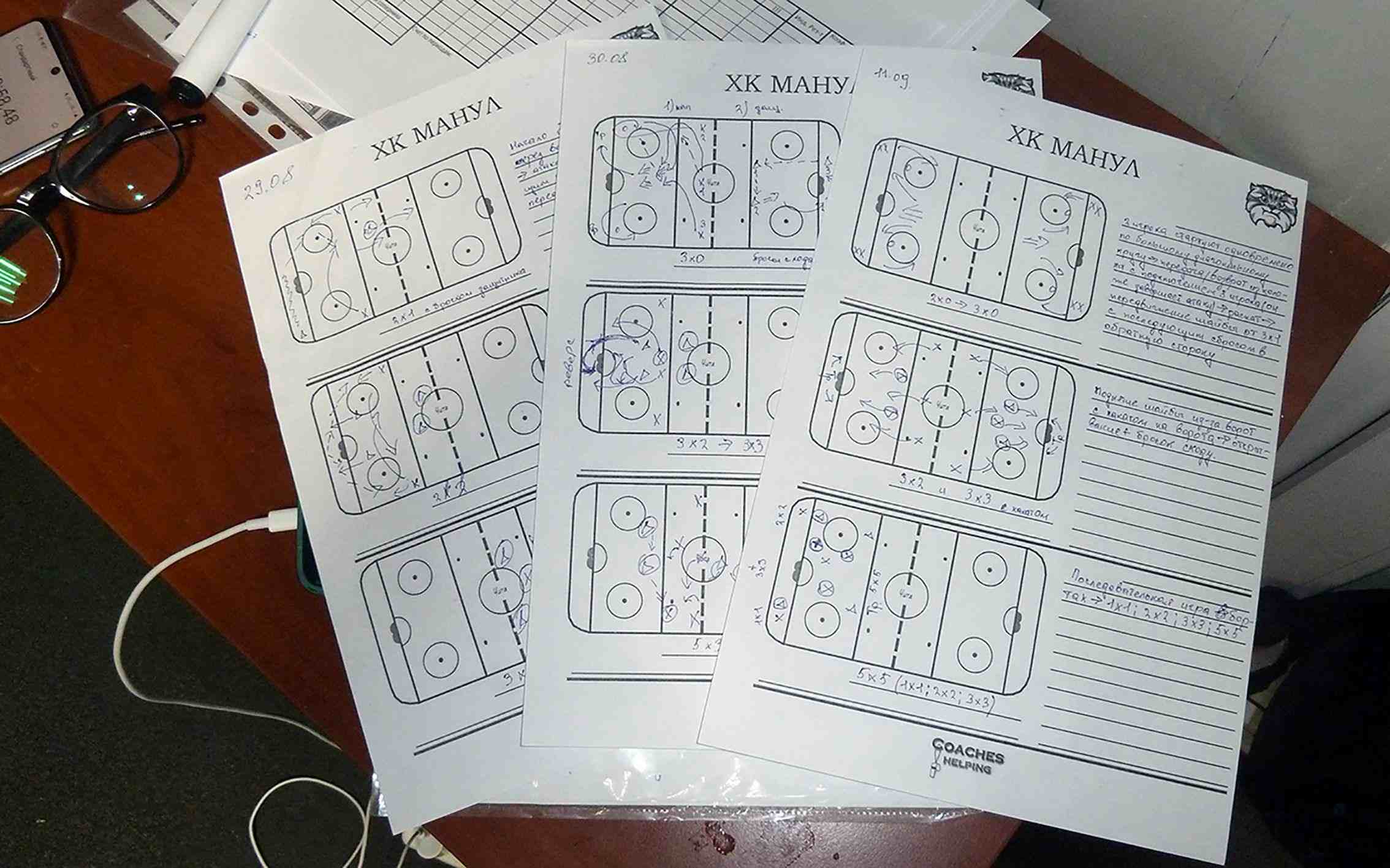 – Обязательно. Я сам продолжаю играть, а также являюсь профессиональным хоккейным судьёй. Домой прихожу, включаю хоккей в гаджете. Утром просыпаюсь – североамериканский хоккей. Это всё на постоянной основе. Иногда люди спрашивают, не устаю ли я от этого. Нет, я получаю максимальное удовольствие. Смотрю на мастеров, на профессионалов, читаю книжки, методические пособия. Но всё потом подстраиваю под себя, под ребят и их техническую оснащённость. Где-то минимизирую то или иное упражнение, а где-то дополняю. Вот они, дощечки, листочки (показывает на кипу бумаг со схемами. – Прим. автора). Ведь работа заключается не только в том, чтобы выйти на лёд, крикнуть и бросить шайбу. Это ещё и бумажная работа. Ты думаешь, рисуешь, потом переносишь на чистые страницы, а после пытаешься воплотить это на льду.
