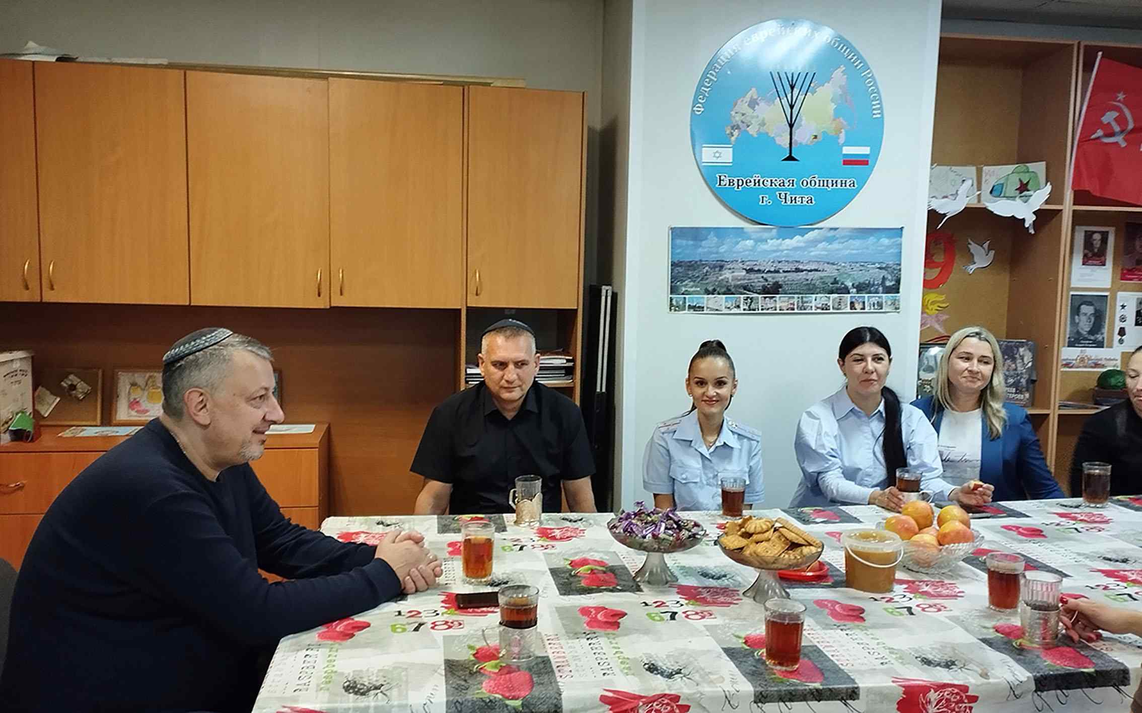 Сотрудники Забайкальского линейного управления МВД России на транспорте совместно с председателем Общественного совета посетили еврейскую общину Забайкальского края, чтобы поздравить её с наступлением еврейского Нового года — Рош ха-Шана. Гости принесли руководителю общины Григорию Еремину традиционные подарки — яблоки с мёдом.