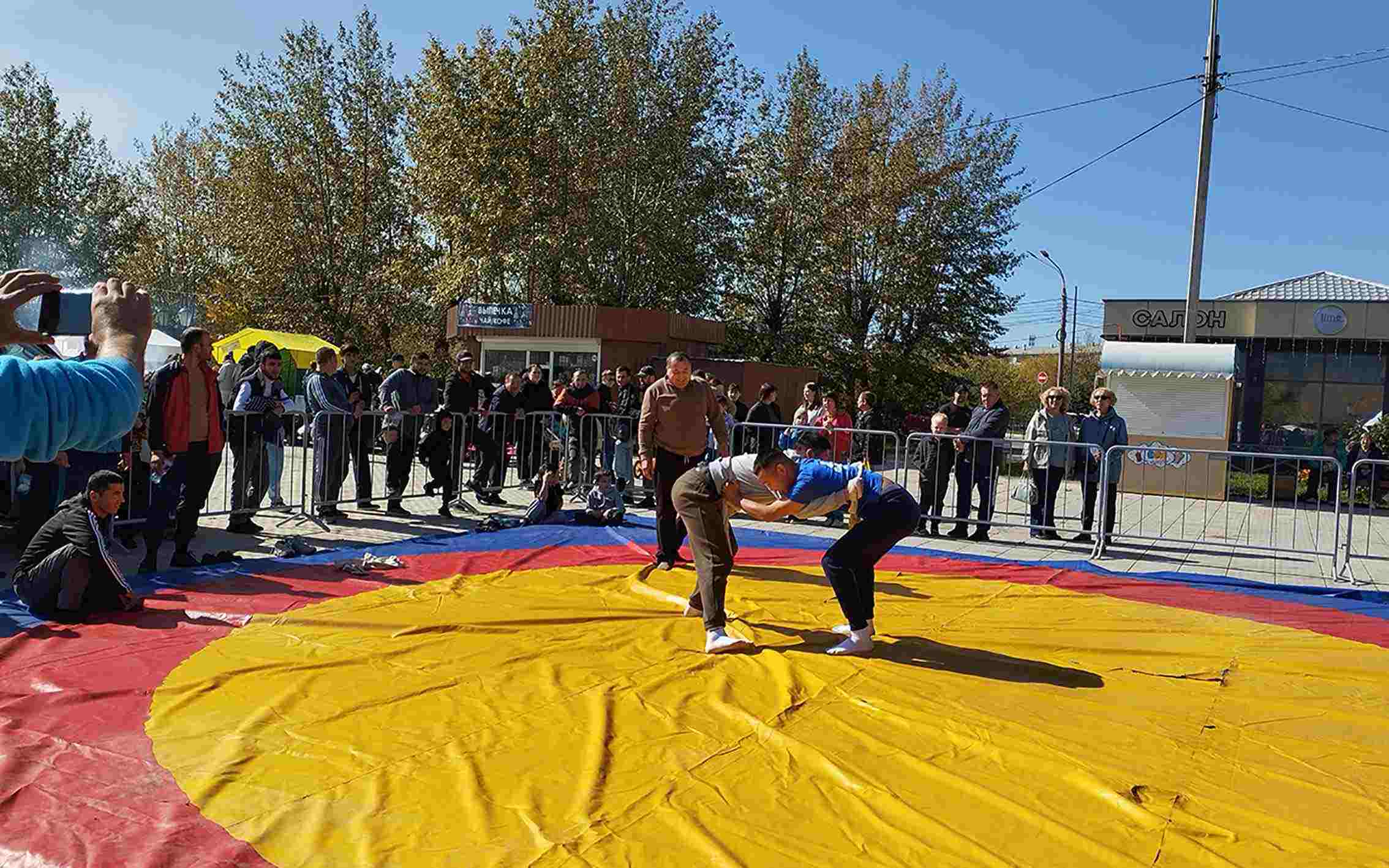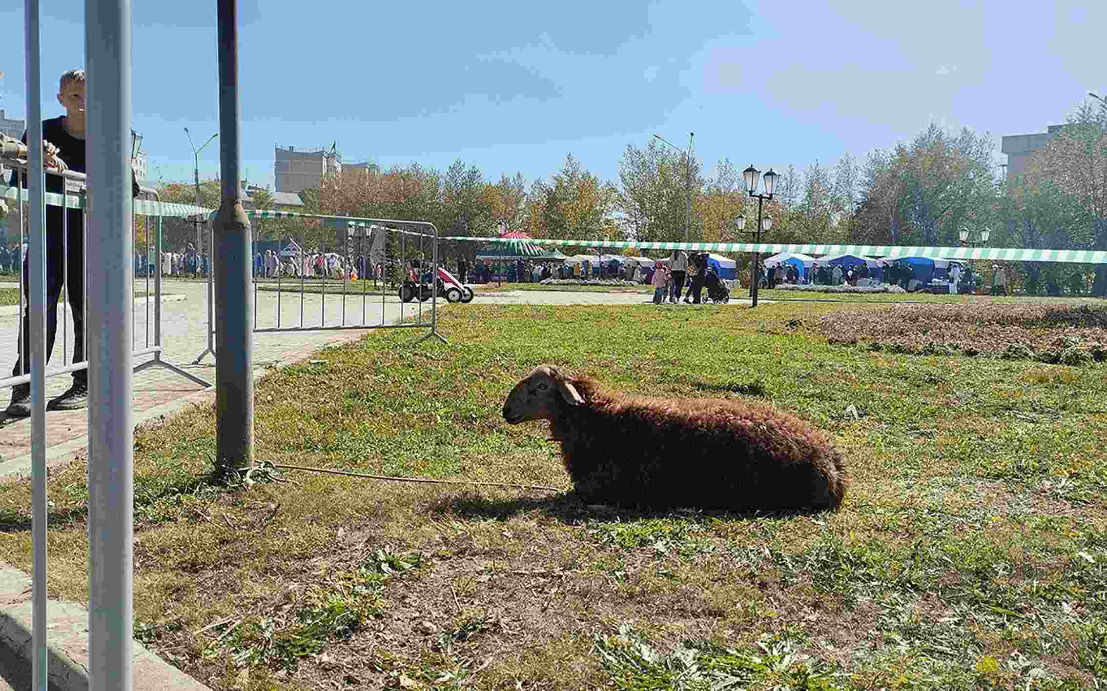 Самой оживленной и громкой стала площадка, где проходила традиционная борьба куреш, организованная таджикской диаспорой. Здесь на кону был живой баран.