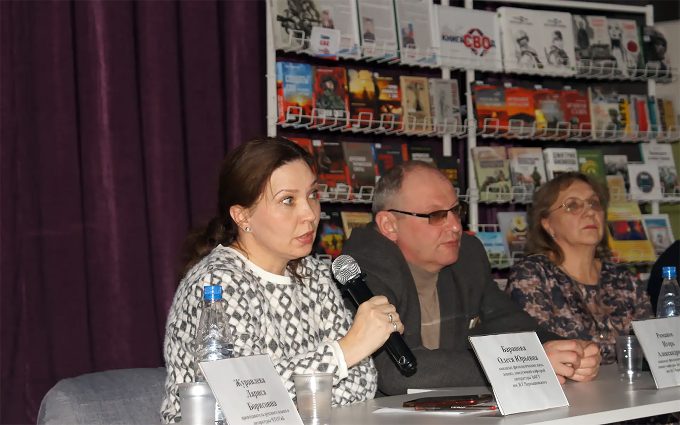 Приветствуя участников дискуссионной площадки, директор ЗКУНБ им. А. С. Пушкина Елена Сивцова, выступившая в качестве модератора встречи, отметила, что произведения, создающиеся в последние годы в связи с происходящими геополитическими событиями, призваны не просто фиксировать события, но и служить источником формирования национального самосознания и сохранения памяти о подвигах наших бойцов для будущих поколений.
